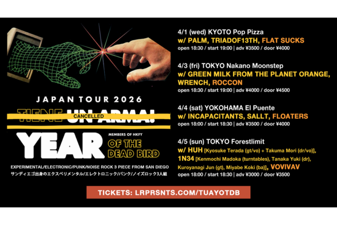 live Newsサンディエゴの死鳥が日本に降り立つ!YEAR OF THE DEAD BIRD来日ツアーが4月に開催! 2026.03.04 日々あれもこれもと規模を問わず発表される来日公演。もはやスケジュール管理も財布もままならないですが、だからこそ「これ来てたのか!」と後から気づくようなことは避けたいところ。特にアンダーグラウンドなバンドは、いつのまにか来 […]