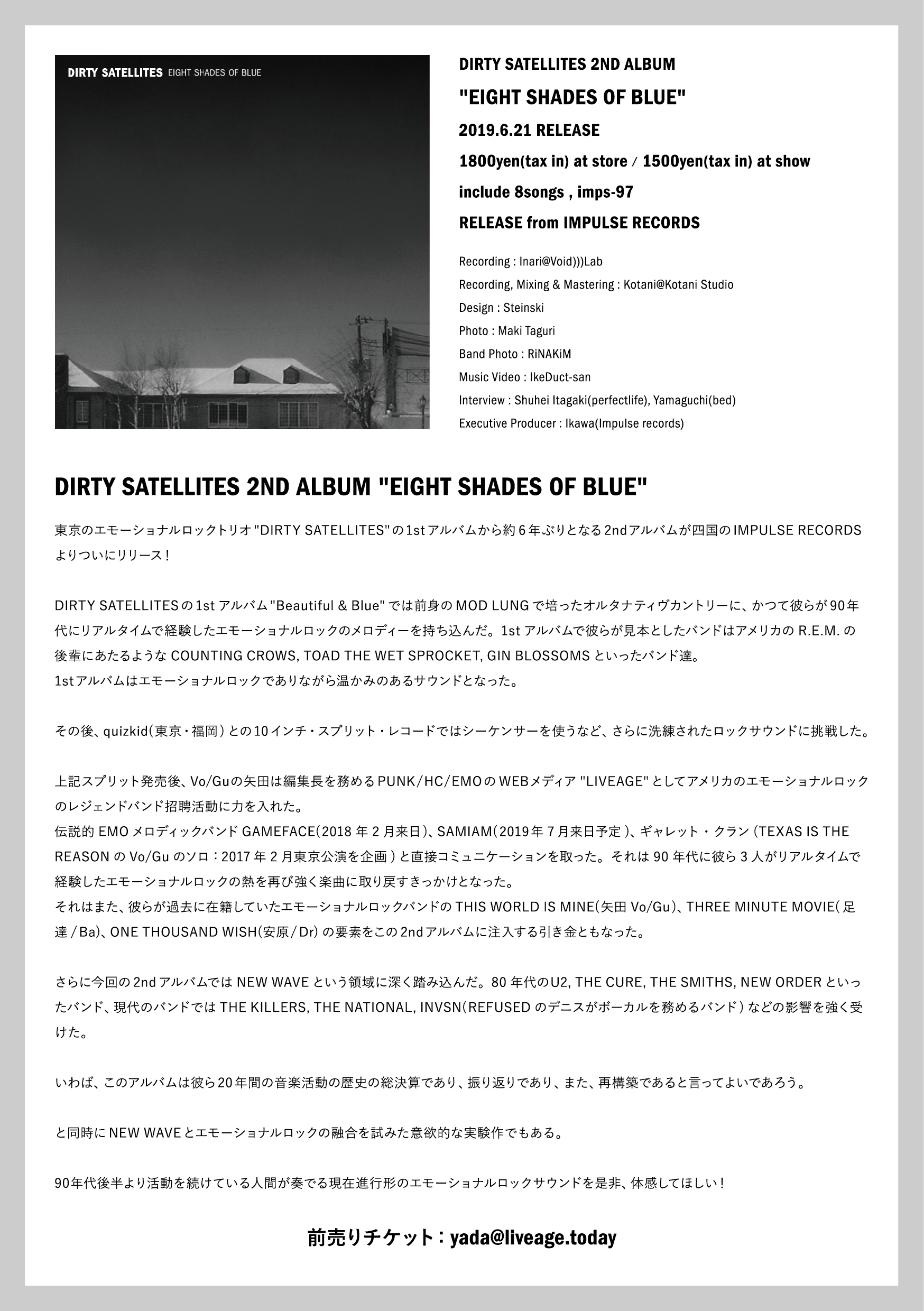 東京のエモーショナルロックトリオ”DIRTY SATELLITES”の1stアルバムから約6年ぶりとなる2ndアルバムが四国のIMPULSE RECORDSよりついにリリース!