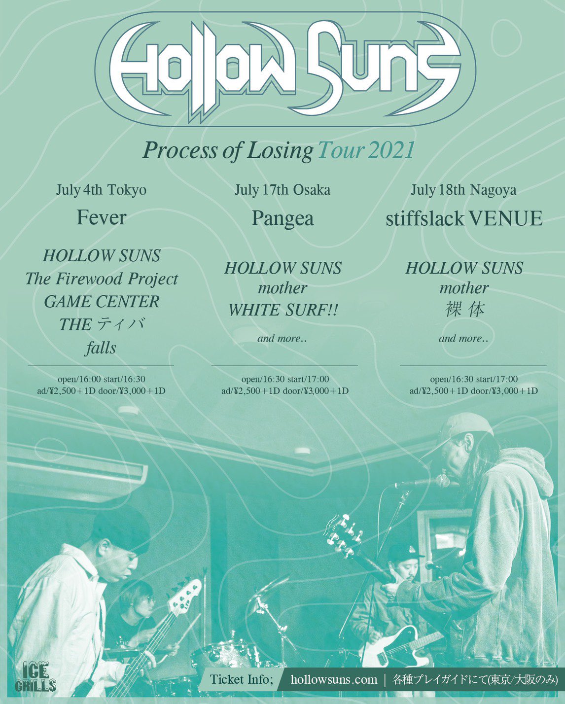 2014年に東京にて結成後、2015年に3曲入りEP「Hollow Suns」をセルフ・リリース。JIMMY EAT WORLD、FOO FIGHTERS、SMASHING PUMPKINSらに代表されるオルタナティブ・ロック、グランジ、パンク、シューゲイザーなど様々な音楽的影響と、バンドのルーツにあるハードコアのグルーヴやメロディック・パンクのフックをブレンドさせたアグレッシブかつパワフルで骨太なロック・サウンドで、結成間もないながらCOUNTRY YARD、SHADOWS、AND PROTECTOR、PALM、waterweedら国内勢から、NOTHING、CITIZEN、ANGEL DU$T、THE MENZINGERSを始めとする数々の海外アーティストのツアー・サポートをこなす。2017年に4曲入り2nd EP「Hollow Suns II」を発表後、カナダのDAGGERMOUTHとUKのGNARWOLVESのジャパン・ツアーに帯同。2018年にcosmicnoteより静岡・三島の盟友AND PROTECTORとのスプリットをリリースし、全12本に及ぶツアーを行うとKOTORI、bacho、ATATA、MEANINGらとも共演。2019年9月にアメリカのSunday Drive Recordsより、5曲入り3rd EP「Into The Water」をリリース。オルタナティブ特有のアグレッシブさの中に、メンバーが思い描くグランジ・サウンドを現代版にアップデートさせたキャッチーでメロディアスな楽曲は、シンプルながらも随所に多様なアイデアを盛り込んだストレートなパンク/ロック・サウンドで話題となり、バンドの成長を感じさせる作品となった。また、同作より使用されているバンドロゴは、TITLE FIGHTのギタリストでPoison Thorn名義でデザイナーとしても幅広く活動するShane Maronが手掛けている。同作リリース後は、自身のレコ発に加えて、シカゴのHOMESAFEとのカップリング・ツアーも行なっている。現在までにCOUNTRY YARD、SHADOWS、bacho、HAWAIIAN6、PALM、waterweed、AND PROTECTOR、FOR A REASONら国内勢から、THE STORY SO FAR、THE MOVIELIFE、THE MENZINGERS、SAMAIM、NOTHING、CITIZEN、ANGEL DU$T、CHUNK! NO, CAPTAIN CHUNK!、RED CITY RADIO、MODERN COLORら海外勢と共演。2021年6月にICE GRILL$より、これまでの4作品を完全網羅した「Process Of Losing」をリリースする。また、7月には新代田FEVER、大阪PANGEA、名古屋stiffslack VENUEにて同作のリリース・ツアーの開催が決定している。