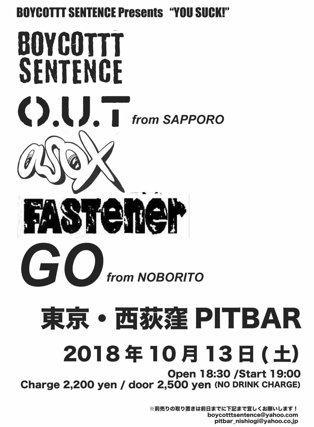 そして10月13日(土)O.U.Tで初めて東京に行きます。昼と夜の2回あります。昼は新宿ヒルバレースタジオでencroached企画、夜は西荻窪ピットバーでBOYCOTTT SENTENCE企画です。O.U.Tが初ライブをした6日後、BOYCOTTT SENTENCEの初ライブもあって同期として親近感を持っています。昼夜両ライブともに素敵なメンツで物怖じしてますが、その辺はアラフィフアラフォーの図々しさでなんとかやりきろうと思っています!