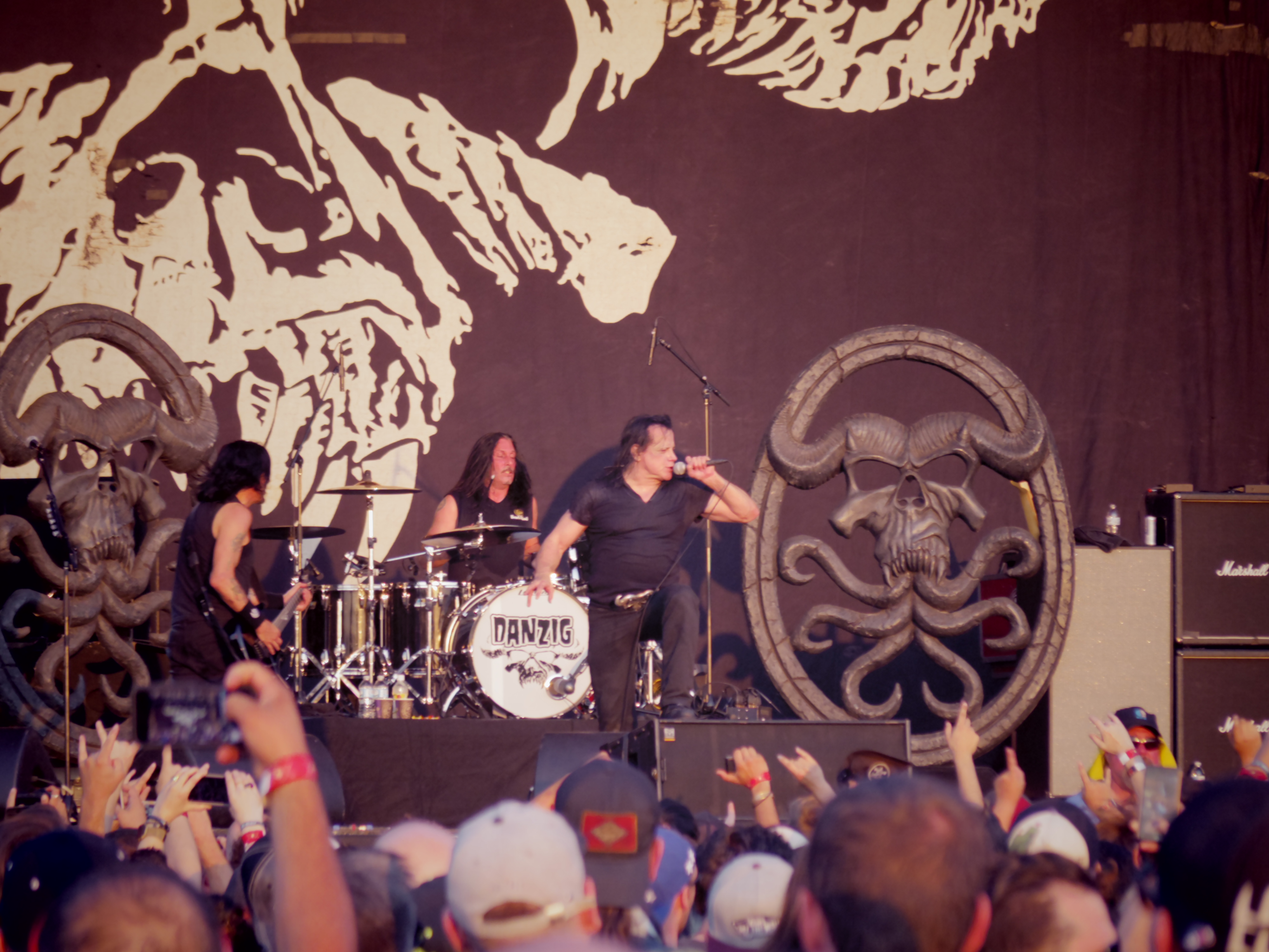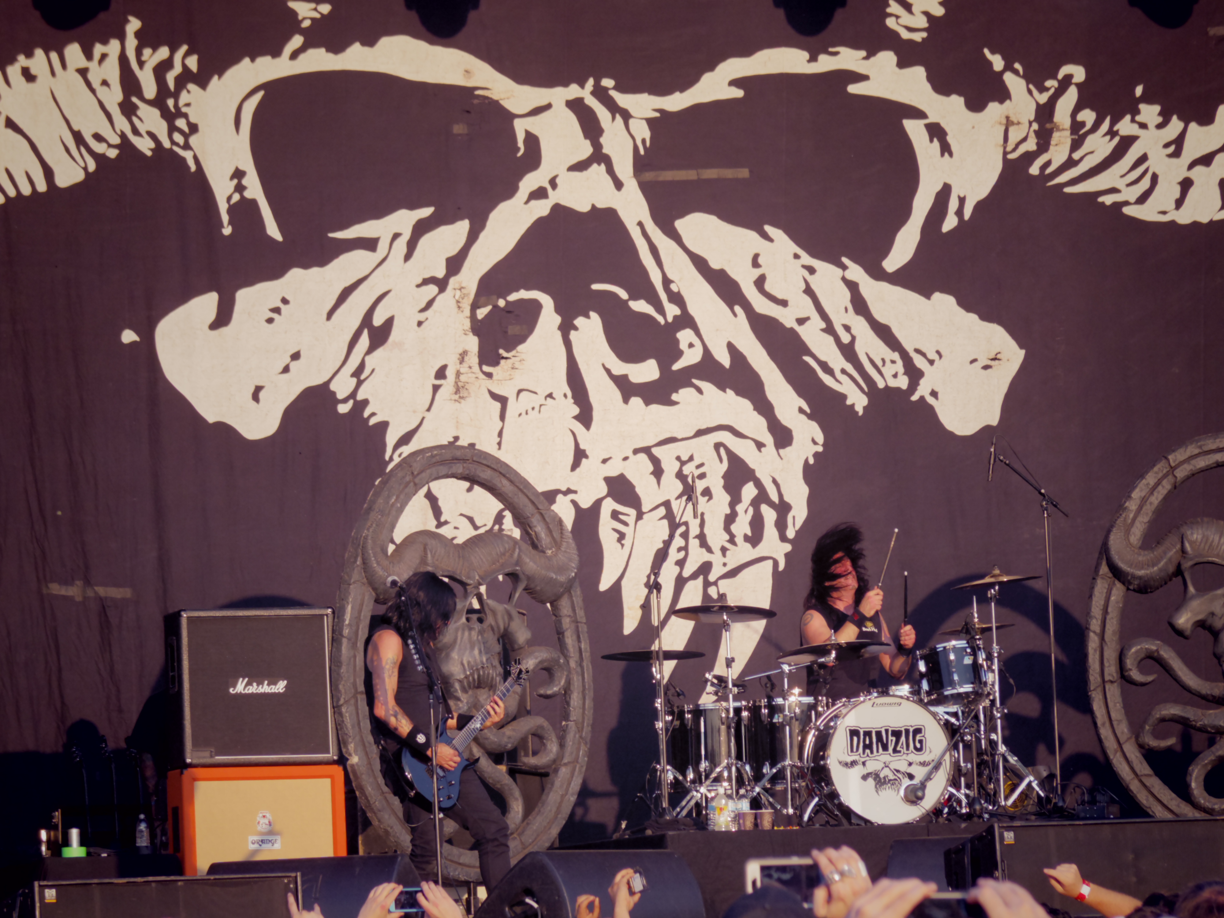 昼間の主要アクトを見届け、ステージ後方の物販スペースなどを散策しながらビールを追加する。DANZIGを観に、心地いい疲労感とともにROOTSステージへ。すでに演奏中だったが、傾き始めた陽に映し出されたステージには、あのダンジグ・スカルのバックドロップと楕円形レリーフが配されていた。